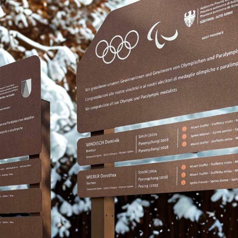 In 32 Gemeinden wurden Ehrentafeln errichtet, die an die Erfolge der Südtiroler Athlet:innen bei den Olympischen Spielen erinnern. Damit werden jene Teilnehmer:innen gewürdigt, die Olympia-Medaillen errungen haben.