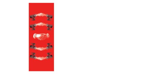 Zentrales Thema ist die Klimakrise: Schneekanonen feiern spielerisch den künstlichen Winter als Symbol menschlicher Kontrolle. Ein Handschlag als Votivbild steht für Macht, Hoffnung und Erfolg vor rotem Hintergrund, der die Dringlichkeit unterstreicht.