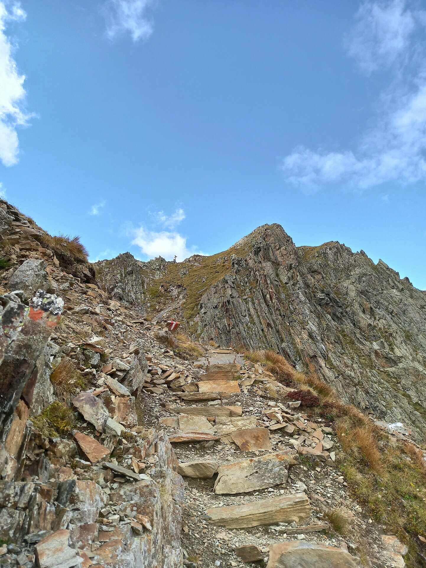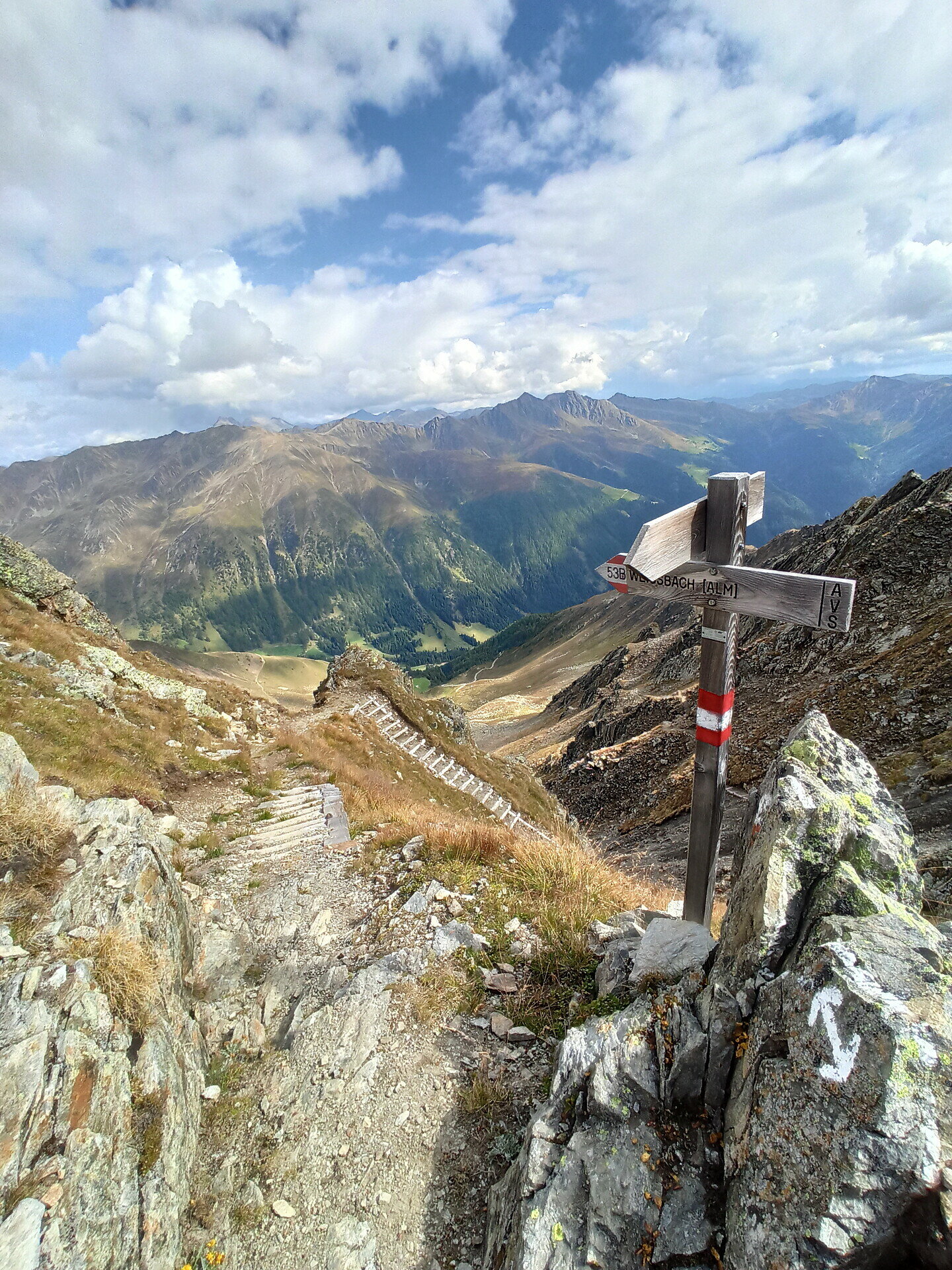 From the Head of the Valley in the Gsiesertal Valley – St. Magdalena (1460 m, paid parking), hike along forest trail no. 53 to the Weißbachalm (2112 m, no refreshments) and continue via the Alpini Steig trail to the Hinterbergkofel (2726 m). From there first follow trail no. 53B and then descend via trail no. 53 to the Staller Saddle (2089 m, A). Return as ascent back to St. Magdalena, variant via Hallscharte (2549 m, trail no. 53).