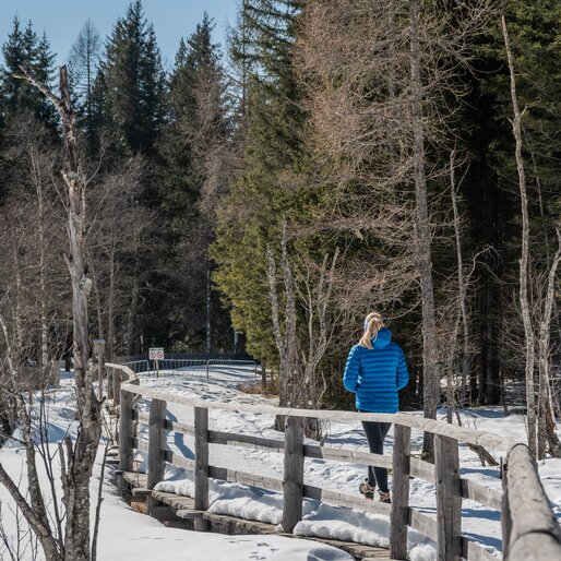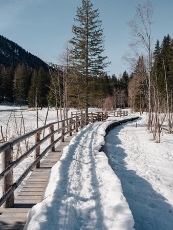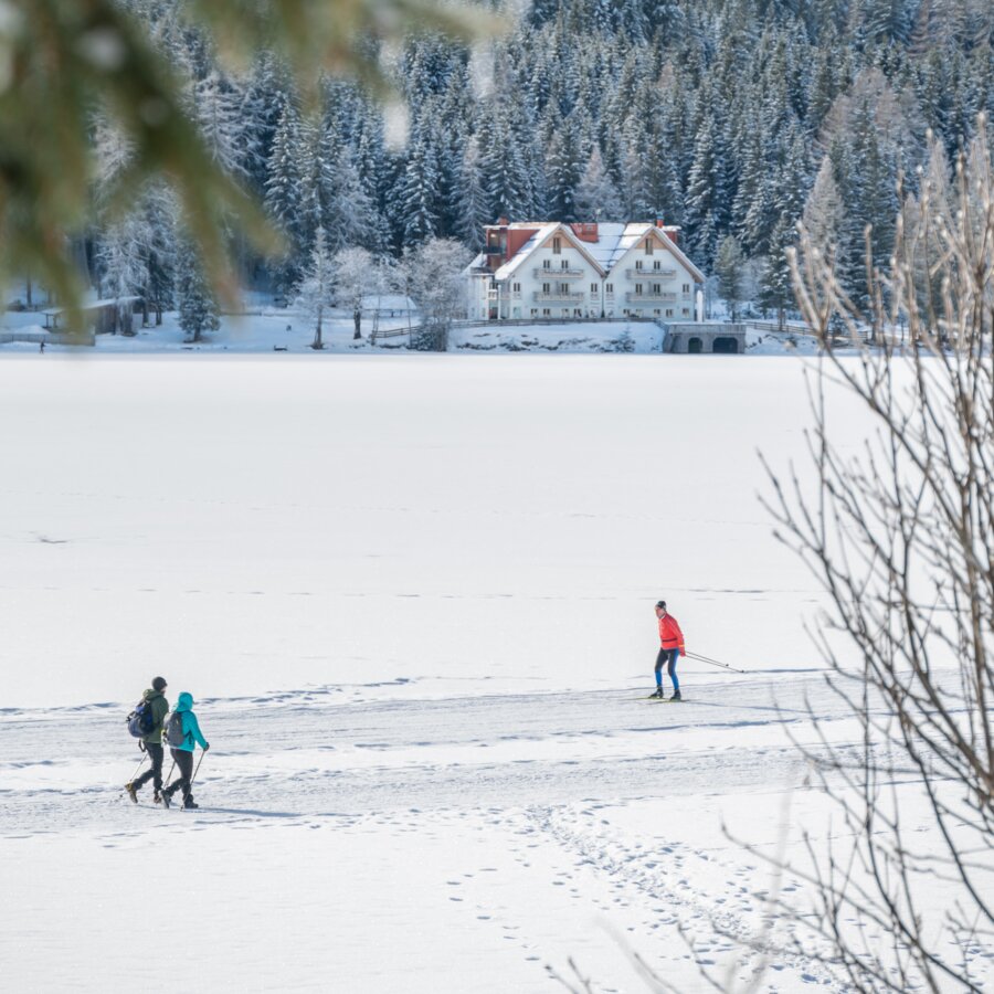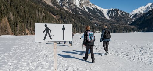 The ice thickness is regularly checked, and the lake is only opened when it is sufficiently thick. Please check before entering whether the Lake Antholz is currently safe to walk on.