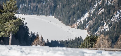 Here you will find the map with the marked trails on the frozen Lake Antholz. The orange-marked path is the winter hiking trail, while the green-marked one is the cross-country ski trail. Please stay on the designated paths to protect nature and ensure everyone's safety!