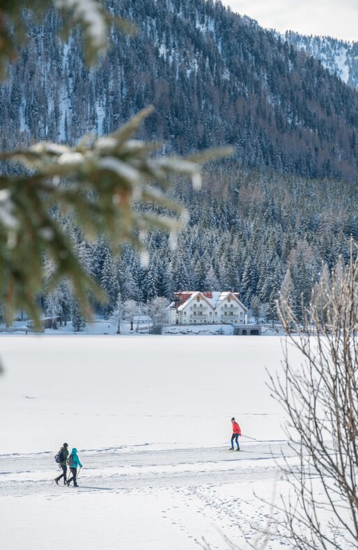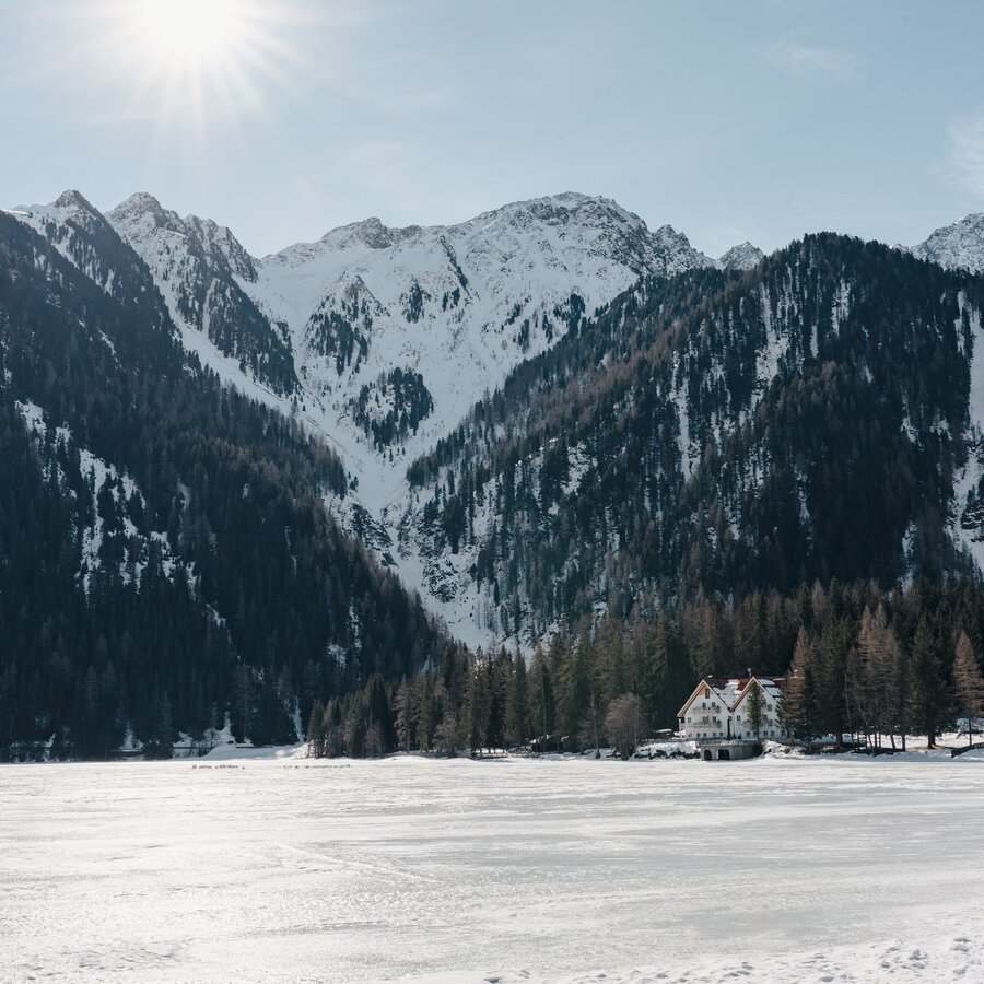Are you up for more? We have some great tips for your activities and experiences all around the Lake Antholz! Walk along the lake's Nature Trail to learn more about its flora and fauna. You may also set out on adventurous tours to admire the lake from above: Imagine a pleasant hike along alpine pastures, a mountaineering tour on one of the surrounding 38 three-thousanders or a mountain bike tour to the Staller Saddle mountain pass. However, the lake is not only a highlight in summer, for as soon as its water freezes in winter, it entices you to practise cross country skiing, to go on winter hikes and to enjoy other winter activities in its snowy fairytale landscape.