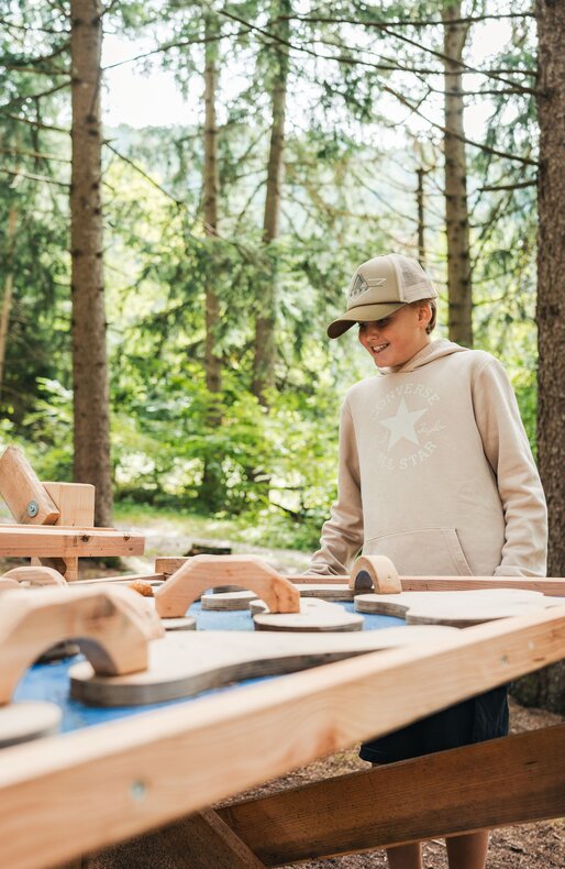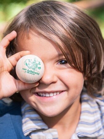 The highlight is the marble water track “Anton’s Journey through the Valley of Water Games”, a nature-based experience stretching across the Antholz Valley. Together with Anton, the cheerful sheep, children guide the wooden ball from station to station: