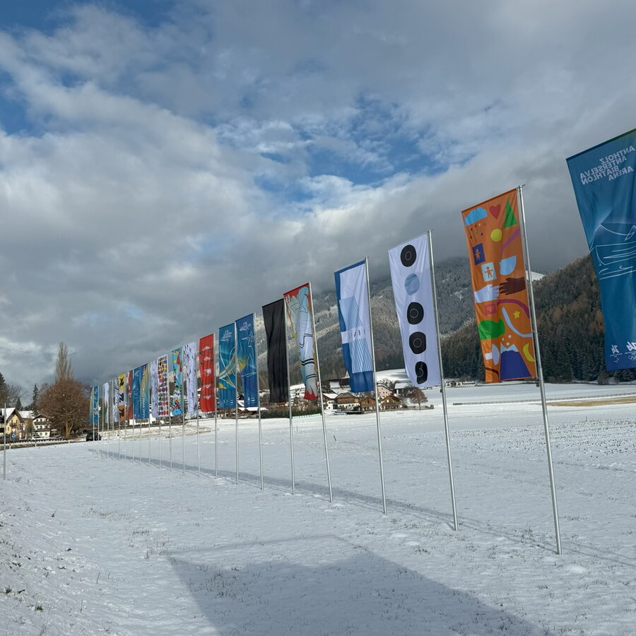 L’Unione Artisti Altoatesini (SKB) e l’ECK Museum of Art hanno invitato artiste e artisti a progettare ciascuno una bandiera. In occasione dei Giochi Olimpici Invernali 2026, queste opere saranno visibili all’ingresso della Valle Anterselva.
