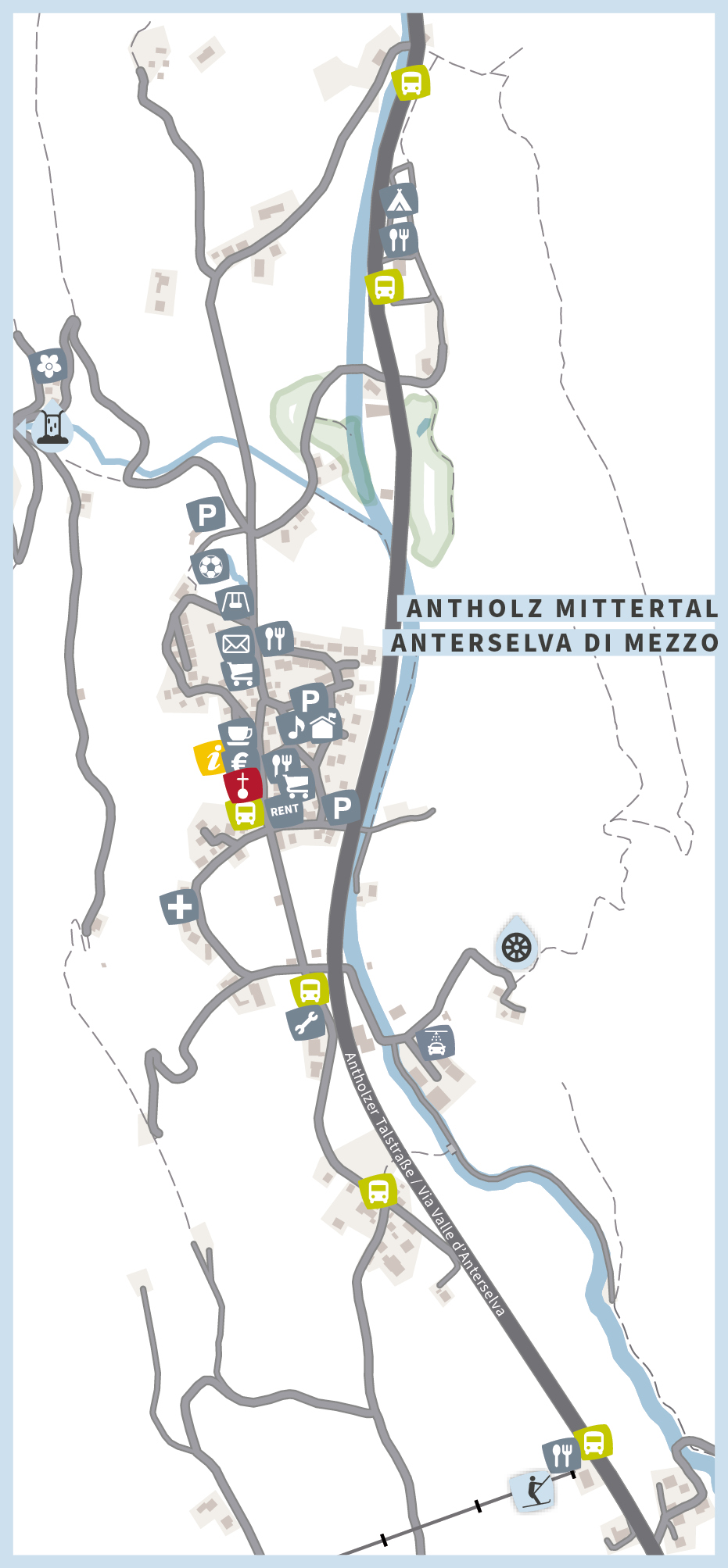Dopo Rasun di Sotto, Anterselva di Mezzo con poco più di 700 abitanti è il secondo paese più popolato della valle blu. Ad un’altezza di 1.250 m, circondato dall'imponente scenario del Gruppo delle Vedrette di Ries, è il punto di partenza ideale per passeggiate, escursioni alle malghe, tour in montagna e gite in bicicletta lungo la ciclabile, fino all'ingresso di Valle Anterselva. Potete inoltre raggiungere il Lago Anterselva e il Passo Stalle anche a piedi, percorrendo il sentiero escursionistico che attraversa entrambi i lati della valle. Sia in estate che in inverno vi attendono emozionanti esperienze nel cuore della natura incontaminata del Parco Naturale Vedrette di Ries-Aurina.