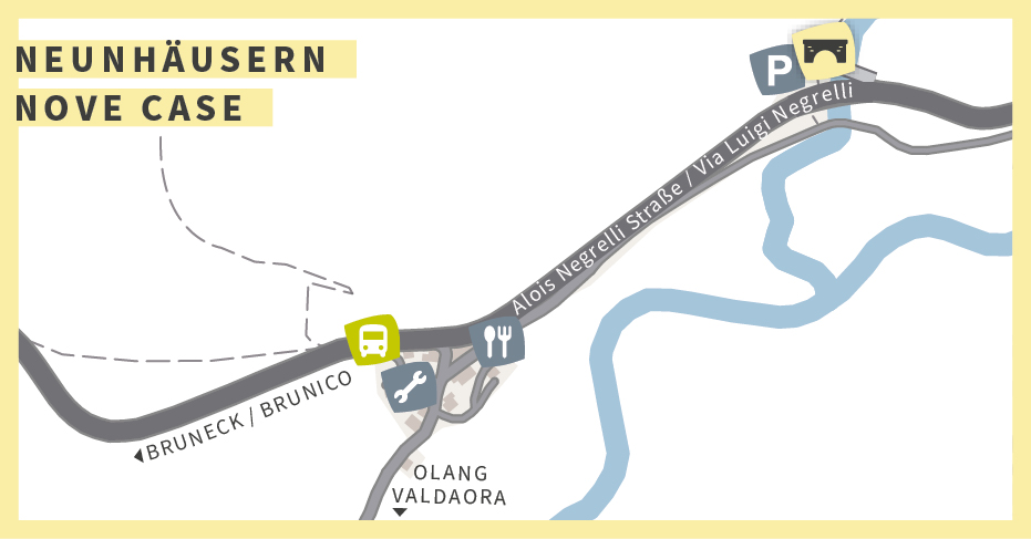 Situato proprio all’intersezione tra la ciclabile di Valle Anterselva e la ciclabile della Val Pusteria – che si estende da Fortezza in Valle Isarco a San Candido nella zona delle Tre Cime – Nove Case costituisce un punto di partenza ideale per vivere emozionanti tour sulle due ruote.