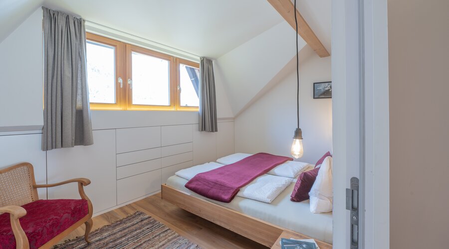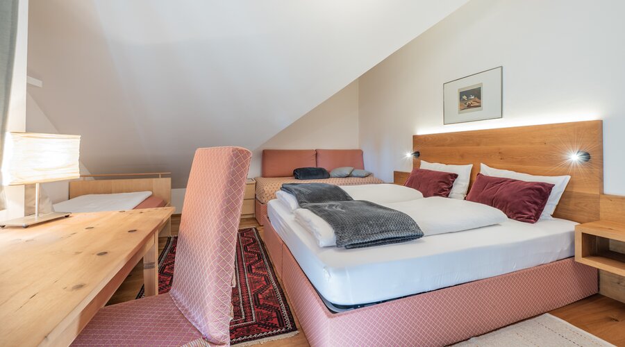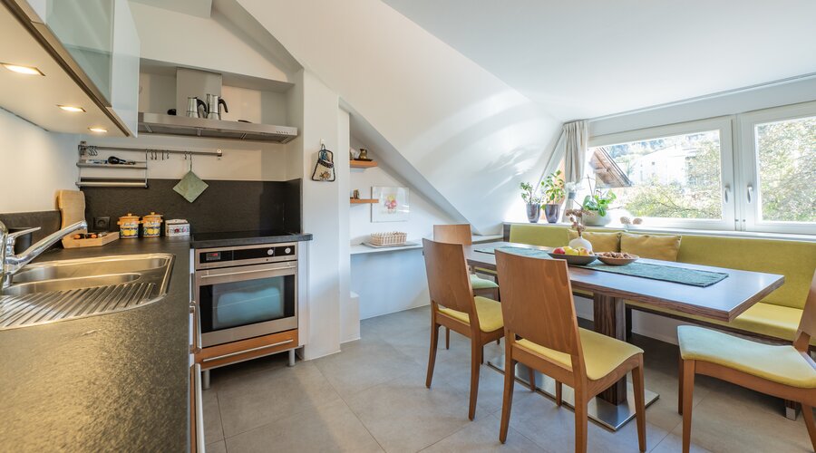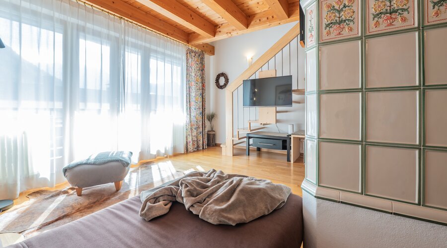 Unser besonders großzügige und komfortable Familienappartement für bis zu 7 Personen heißt Sie mit ganz viel Gemütlichkeit und Wohlfühlatmosphäre auf über 80 m² willkommen: Die moderne Wohnküche mit gemütlicher Eckbank und großem Esstisch ist perfekt für gemeinsame Kochabende mit Familie und Freunden. Im Wohnzimmer mit Kachelofen und Schlafcouch kuschelt es sich am Abend am besten. Ein Doppelbett-Zimmer mit Bad en suite bietet maximalen Komfort. Ein weiteres Familien-Schlafzimmer mit 1 Doppelbett und 2 Einzelbetten finden bis zu 4 weitere Personen Platz. Ein großes, modernes Badezimmer rundet unser Ferienappartement ab.