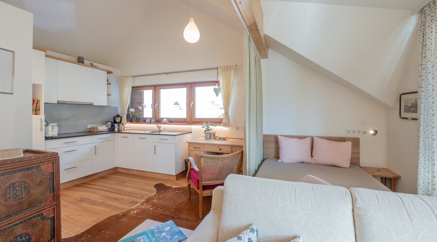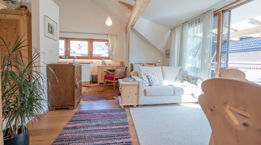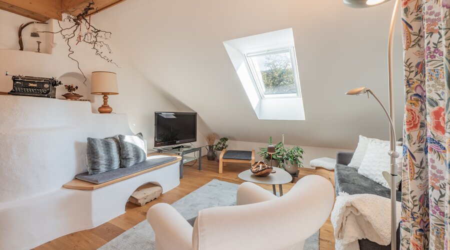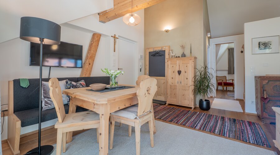 Schon beim ersten Schritt in den lichtdurchfluteten und gemütlichen Wohn- und Essbereich werden Sie von der wohnlichen Atmosphäre dieses Appartements begrüßt: Liebevoll eingerichtet und komfortabel ausgestattet fühlen Sie sich hier sofort wie daheim. Selbst restaurierte Einzelstücke haben wir sorgfältig mit modernen Möbel und Böden aus Naturholz kombiniert.