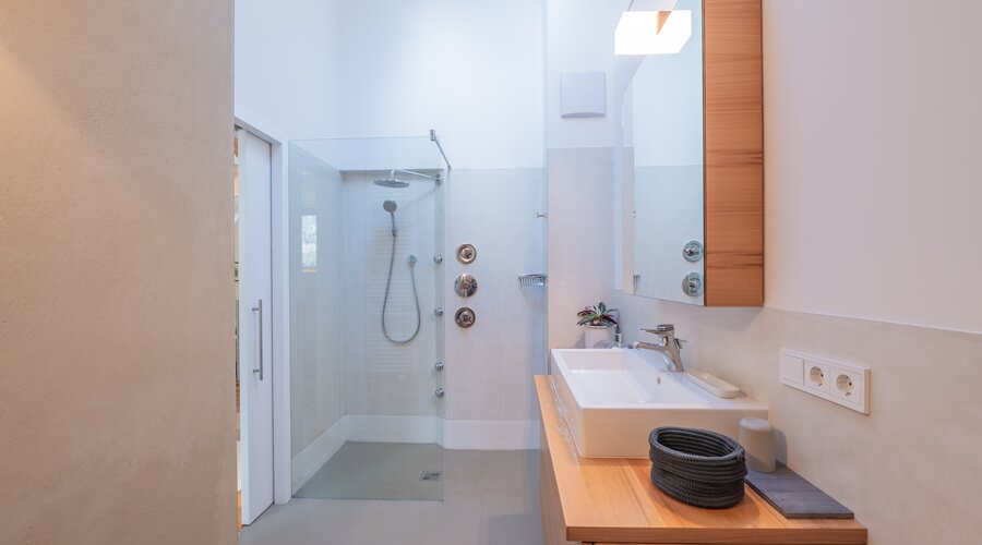 Der geräumige, helle Wohnraum mit gemütlicher Sitzgruppe, Couch und TV und moderner Einbauküche bieten jeden Komfort – genauso wie das stilvolle Badezimmer mit Regendusche. Erholung finden Sie im ruhigen Schlafzimmer mit Doppelbett aus Vollholz. Zusätzlich gibt es im Wohnraum ein Doppelbett.
